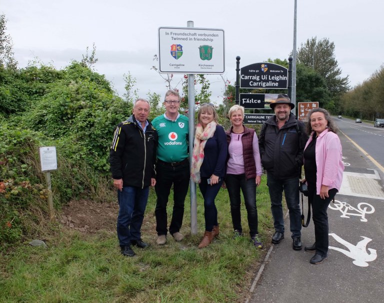 Bei gutem Essen und Getränken im Hotel gab es die offiziellen Begrüßungen von Jim Kelly (VorsitzenCarrigaline 2019 Maibaumübergabe 1der des Partnerschaftsvereins in Carrigaline), Seamus McGrath (Stadtrat of the Minicipal District Council Cork in Vertretung des Bezirkbürgermeisters) und Udo Ockel (Erster Bürgermeister vom Markt Kirchseeon). Als besonderes Gastgeschenk konnten wir diesmal dank des Transporters ein Stück Maibaum überreichen, der erst am 14.09. am Marktplatz in Kirchseeon umgelegt wurde. Den ca. 2 m langen Stumpf zieren drei Schilder, die Wappen von Kirchseeon und Carrigaline sowie eine Collage des Kirchseeoner Künstlers Hans Niedermaier. Die Überraschung war perfekt, als zwei starke Kirchseeoner in Tracht den Baum hereinbrachten und übergaben.